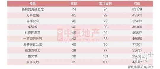 在个盘成交量方面,位于宝安中心区的新锦安海纳公馆以74套的成交量继续居榜首。与之前一周相比,两周的成交量前十名的个盘高度重合——有8个楼盘均进入前十。