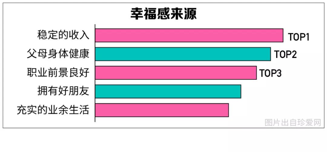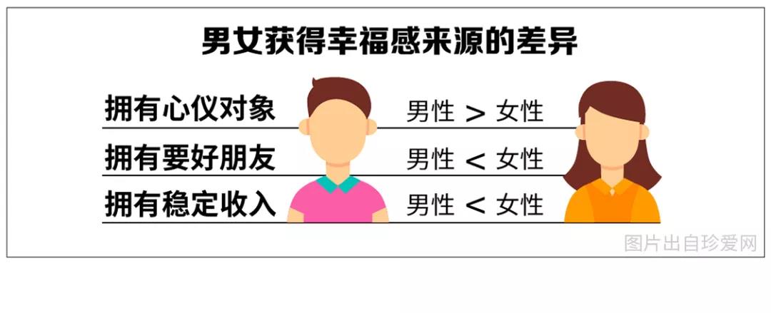 深入研究发现,男性对“拥有心仪对象”的需求比例(6.67%)略高于女性(3.17%),女性则是在拥有要好朋友的比例(28.79%)上高于男性(6.67%),且因为稳定收入感到幸福的女性比例(60%)比男性(53%)更高。可见,女性更容易从稳定的收入中获得幸福感。