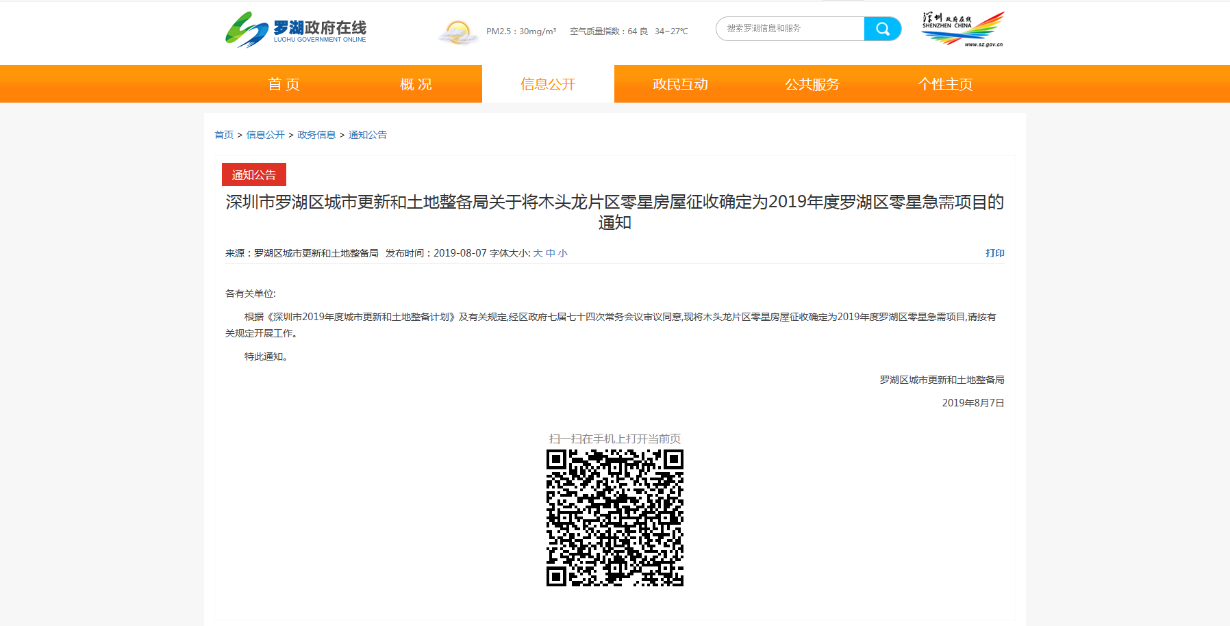 “经过全面分析,木头龙项目涉及众多公共利益、现状存在重大社会风险的情况下,根据《深圳市2019年度城市更新和土地整备计划》房屋征收专项计划中明确的‘考虑到各区公共利益项目的急需,各区区级房屋征收计划可安排零星急需项目1项’,罗湖区政府将木头龙片区零星房屋征收确定为2019年度罗湖区零星急需项目,并启动征收程序,尽快破解重大历史遗留难题,防范和化解重大风险,落实项目配套的交通设施、保障性住房等急需公共利益。”他说,政府将依法依规实施房屋征收并进行征收补偿,保障被征收人的合法权益。