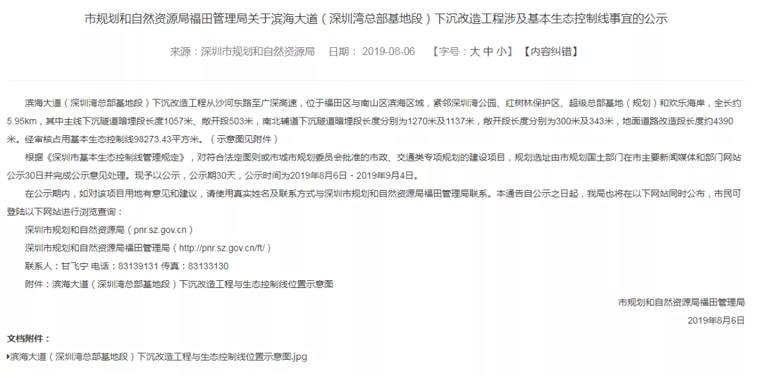 目前滨海大道(深圳湾总部基地段)下沉改造工程正公示中,公示期至9月4日
