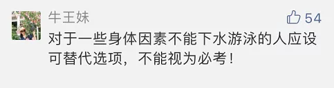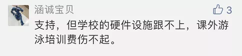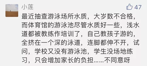 对于游泳纳入中考体育必考选项,家长们的看法不一。支持者认为,“游泳本来就是一项求生技能,纳入考试,孩子们都要学习,除了锻炼身体,还能减少意外的发生。”也有人认为“很多学校都没有开设游泳课,学习硬件设施跟不上也白搭。”反对者则认为,“游泳实际生活中使用频率极低,并不能作为普适性健身运动,纳入选考更合适”“学校的硬件设施跟不上,课外游泳培训费伤不起。”