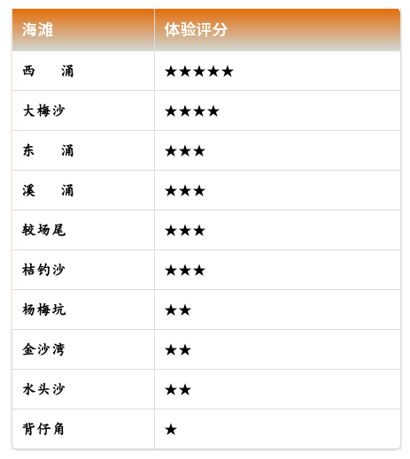 连日来,记者兵分多路,以自西向东、距离市区“由近及远”的方向沿海暴走,对其中10个知晓率最高的海滩进行体验式走访,以“开放情况、是否收费、能否停车、便民服务、沙滩清洁、海域安全”六个方面为指标,以五星为满分进行了好感度评分。