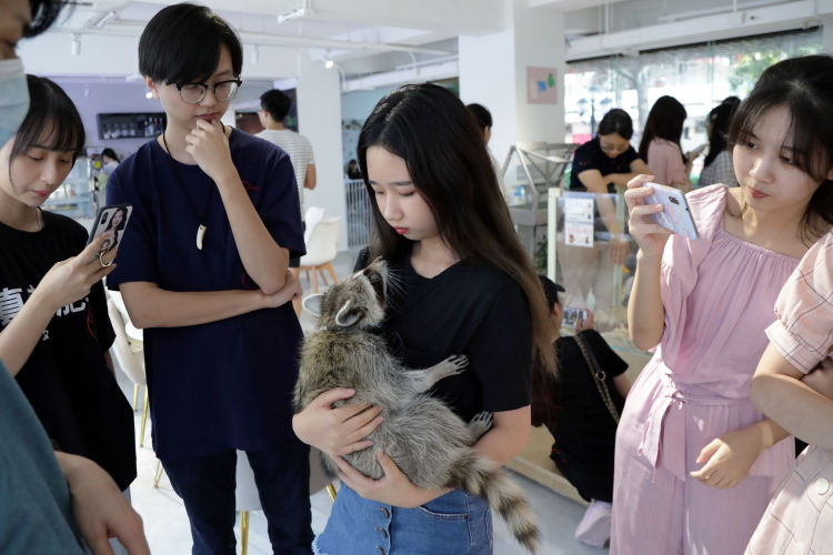 除了小动物和饲养员们,这里还聚集了许多年轻女孩儿,她们有的相互认识,轮流跟店里的小浣熊挠痒痒拍照;有的不认识彼此,却因为饲养过同样的小动物而熟络起来,相互传授养育自家"孩子"的经验。这只名为"六一"的小浣熊是这里的常驻小动物,面对市民们的热情,"六一"毫不客气地躺在小姐姐的臂弯里撒娇,引来其他市民们争相拍照。