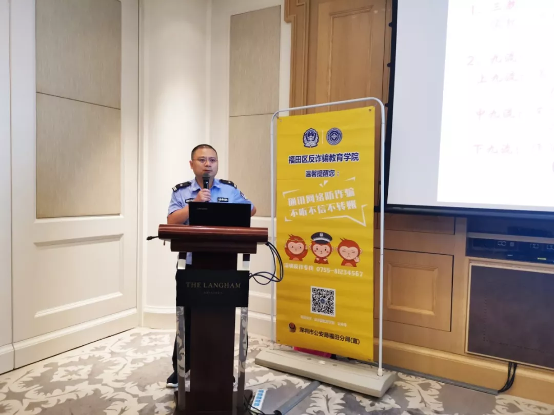 本次公开课由福田分局反诈民警讲师黄旭波主讲,黄警官通过播放宣传短视频,为学员生动有力地剖析了公检法诈骗、象棋残局诈骗、看手相诈骗等具体诈骗案例,并给出了相关的防范建议。