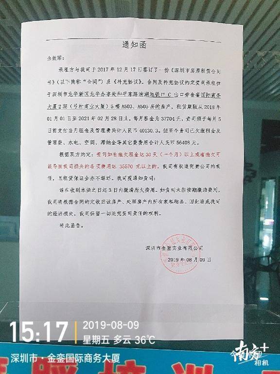 事实上,攸攸舞蹈学校清湖校区因“不定期停电影响正常上课”的情况自今年5月30日已出现,当时即有学员猜测是校方拖欠租金所致。而8月9日,舞蹈室门外出现了一份落款为深圳市金篮实业有限公司的通知函,上面显示该校区已欠缴租金、管理费、水电等费用总计56408元。足见欠费已持续一段时间。
