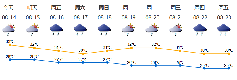 我市今天多云,有短时阵雨或雷阵雨;气温28-33℃;西南风2-3级;相对湿度70%-90%。