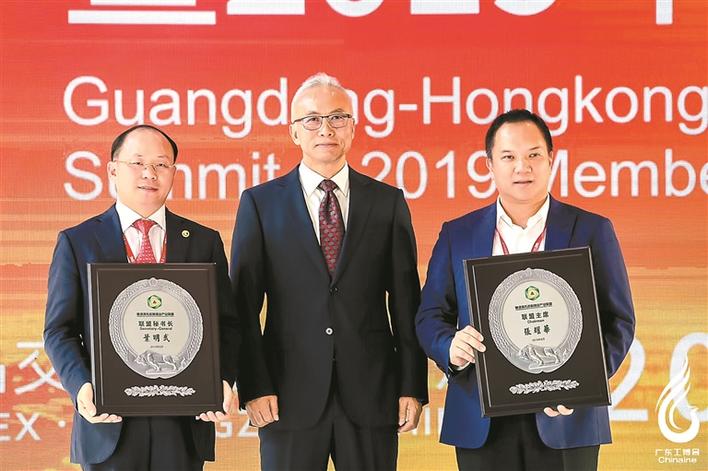 ▲2019年8月8日,中国国际贸易促进委员会机械行业分会会长孙喜田(中)向张耀华(右一)授予粤港澳先进制造业产业联盟主席牌匾。