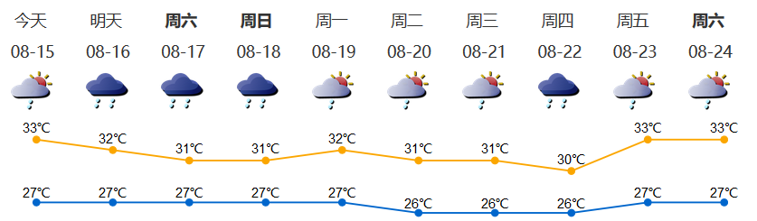 我市今天多云有阵雨或雷阵雨,部分时间雨势大;气温27-33℃;西南风2-3级;相对湿度65%-95%。