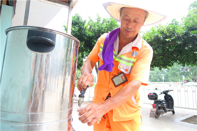 “现在天气热,各类生活垃圾多了起来,特别是瓜果蔬菜,如果不及时清理的话,很容易腐烂发臭,影响市容市貌和居民生活。”杨伯伦说,夏季以来,他们的工作量增加了好几倍,每天自己带来的水都不够喝,好在旁边的药店会免费提供消暑茶给路人解暑,感觉很人性化。