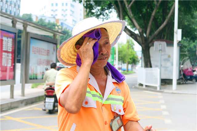 8月13日,正午时分的太阳火辣辣,室外温度已经达到36℃。行道树的树叶都被晒得打了卷,空气中的热浪让人有些喘不过气来。此时,环卫工人杨伯伦身穿橘红色的马甲,头戴着草帽,正坐在路旁的树荫下休息。