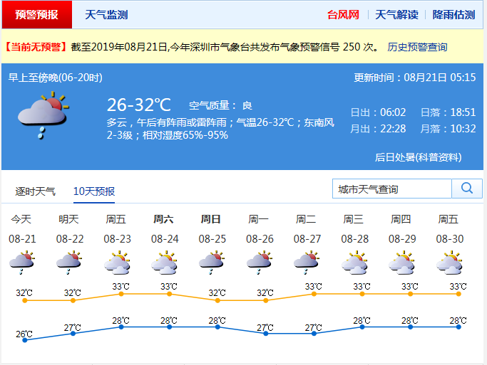 见圳客户端·深圳新闻网2019年8月21日讯(见圳客户端·深圳新闻网记者 高畅韵)记者从市气象局了解到,昨日我市白天最高气温31 ℃ -33 ℃,中北部最高气温达到35 ℃。今日多云,有(雷)阵雨;22-24日多云间晴天,局部有短时(雷)阵雨,部分地区最高气温可达35 ℃左右;25-26日有(雷)阵雨,气温有所回落。