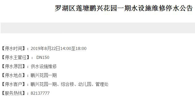 见圳客户端·深圳新闻网2019年8月22日讯 据深圳水务集团官网消息,8月22日这些片区计划停水。其中,罗湖区莲塘鹏兴花园一期因供水设施维修,停水时间为下午2:00-6:00;其他片区停水时间为夜间。请受影响的市民提前做好准备。