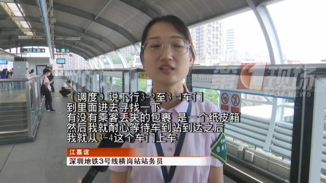 当时,一辆列车即将到达龙岗的横岗站,站务员从3-4号门上车寻找。最终,站务员在列车座位下面找到了乘客遗失的纸箱,