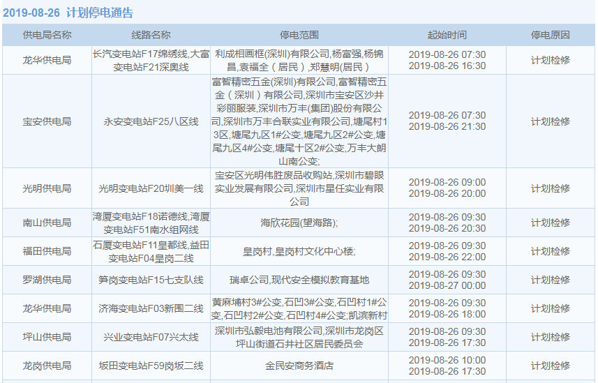 8月26日计划停电通知: