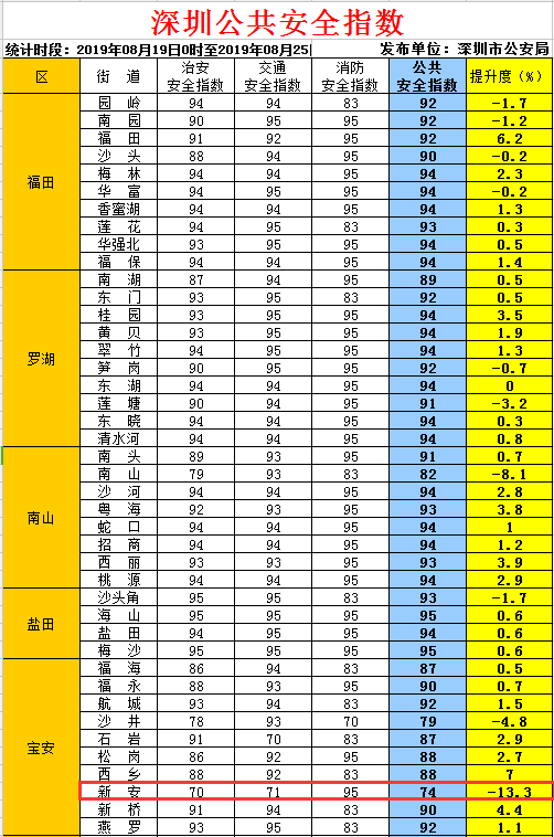 见圳客户端·深圳新闻网2019年8月27日讯 深圳市公安局围绕市委市政府“城市管理治理年”工作部署要求,借鉴国内其他城市的成功做法,于2016年4月5日开始,每周通过《深圳特区报》、《深圳新闻网》、市公安局门户网站、公安微信、微博,向社会发布一次深圳公共安全指数,保障市民群众知情权、监督权,引导社会各界广泛参与“平安深圳”建设。