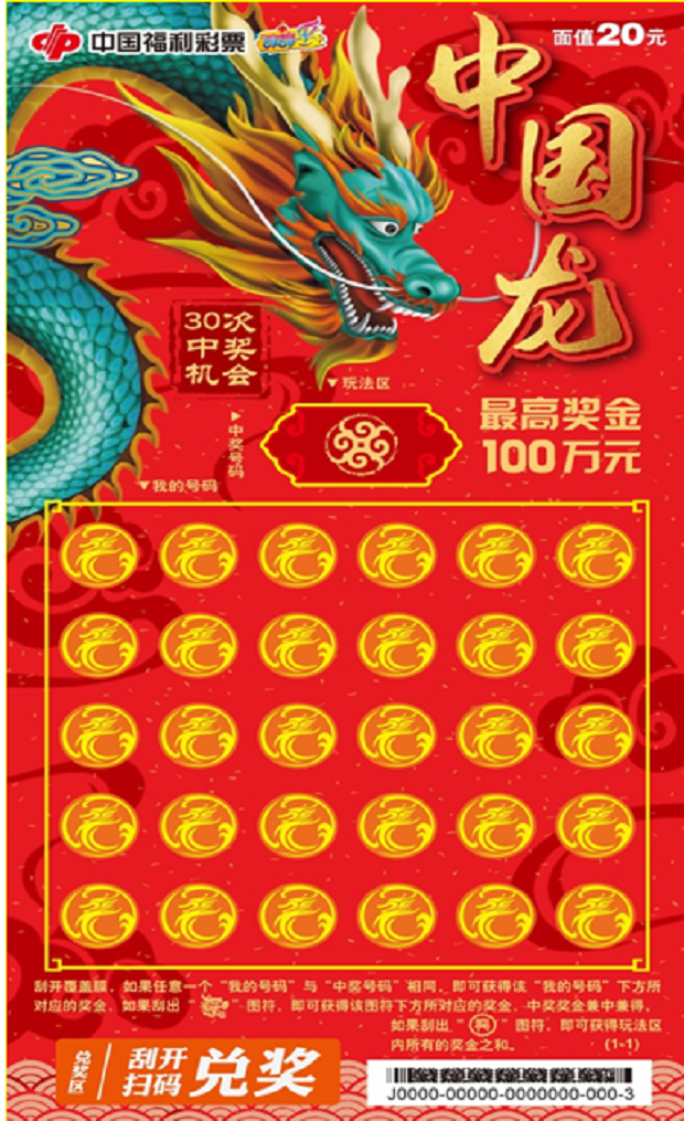 “龙”,是中华民族的象征,是华夏女儿祈求平安和幸福的精神向往,“祥龙送福”也成为根植在中国人心中的美好愿望。福利彩票刮刮乐新票“中国龙”,整体颜色采用中国红,加以黄色搭配,恰与国旗的红、黄相协调,以龙为主要元素,底部的云层与祥云,使得龙的形象翱翔于天空,隐喻祖国一飞冲天。“中国龙”面值20元,返奖率65%,最高奖金100万元。