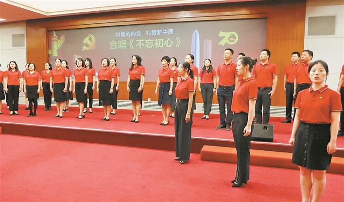 日前,深圳市妇联在市民中心举办“不忘初心、牢记使命”主题教育党日活动暨“服务阳光女工,共创特区未来”项目展示交流活动。图为党员合唱《不忘初心》。 深圳特区报记者 程海昆 摄