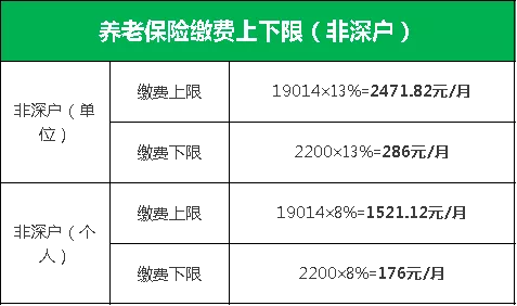 缴费基数:为职工上月工资总额,最高为上年度广东省全口径城镇单位就业人员月平均工资6338元的3倍,即19014元,最低为深圳市最低月工资标准2200元。