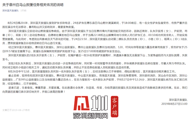 见圳客户端•深圳新闻网2019年8月30日讯(见圳客户端、深圳新闻网记者 张玲)8月27日下午,深圳蓝天救援队发布消息称:8月25日,救援队两名队友在掩护最后一批受困驴友撤离时,突遇溪水暴涨无法直接下山,为紧急避险而与大部队脱离失联。8月27日中午,最终将两名队友找回,经确认,两名队员许挺秀(女)、尹起贺已不幸牺牲。