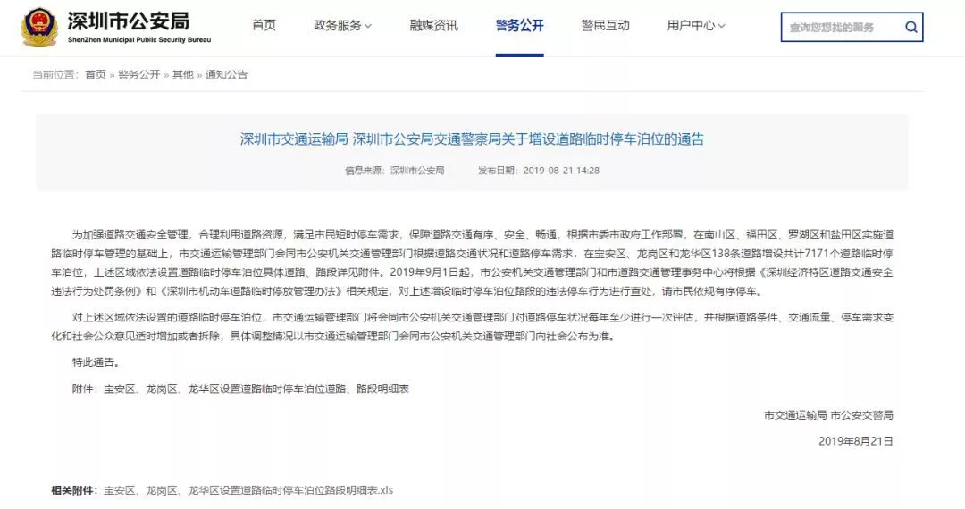 据悉,2019年9月1日起,市公安机关交通管理部门和市道路交通管理事务中心将根据《深圳经济特区道路交通安全违法行为处罚条例》和《深圳市机动车道路临时停放管理办法》相关规定,对上述增设临时停车泊位路段的违法停车行为进行查处,请市民依规有序停车。