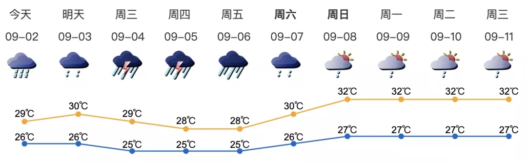 我市阴天间多云,有间歇性阵雨或雷阵雨,部分时间雨势较大;气温26-29℃;偏东风4级,沿海和高地最大阵风8级左右;相对湿度75%-95%