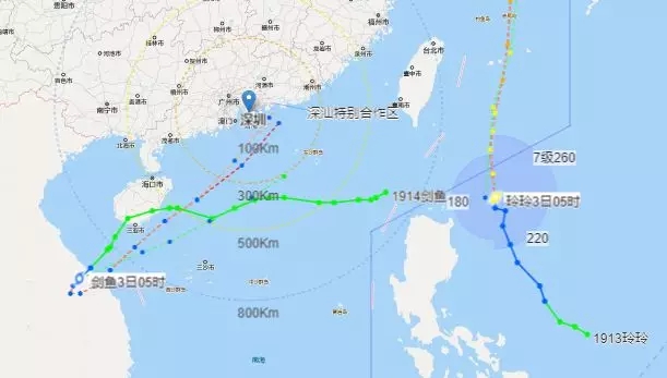 见圳客户端.深圳新闻网2019年9月3日讯 9月2日,今年第13号台风“玲玲”(强热带风暴级)生成,将向台湾以东洋面靠近。今日2时,记者从深圳市气象台获悉,另一个南海低压也已加强为今年第14号台风“剑鱼”(热带风暴级),5时其中心位于深圳市西南方大约1000公里,中心附近最大风力8级(64公里/小时),中心最低气压995百帕。今明两天其将在越南中部沿海一带徘徊打转,之后可能转向东北方向移动并靠近广东沿海。