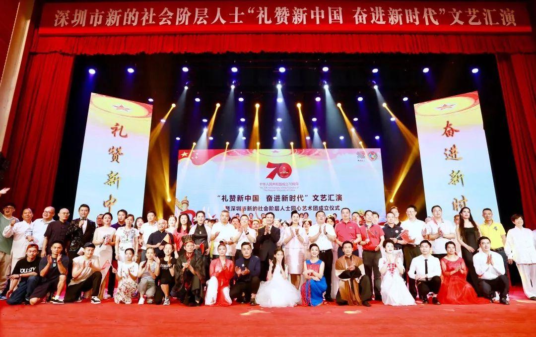 演出前,深圳市新的社会阶层人士同心艺术团揭牌。本次文艺汇演是在市委统战部指导下,以及各区统战部门支持下,由市新联会牵头,联合各区新联会共同举办的献礼新中国成立70周年庆祝活动之一。现场气氛喜庆温馨,通过网络直播的方式和场外新的社会阶层人士和十多万名观众互动。