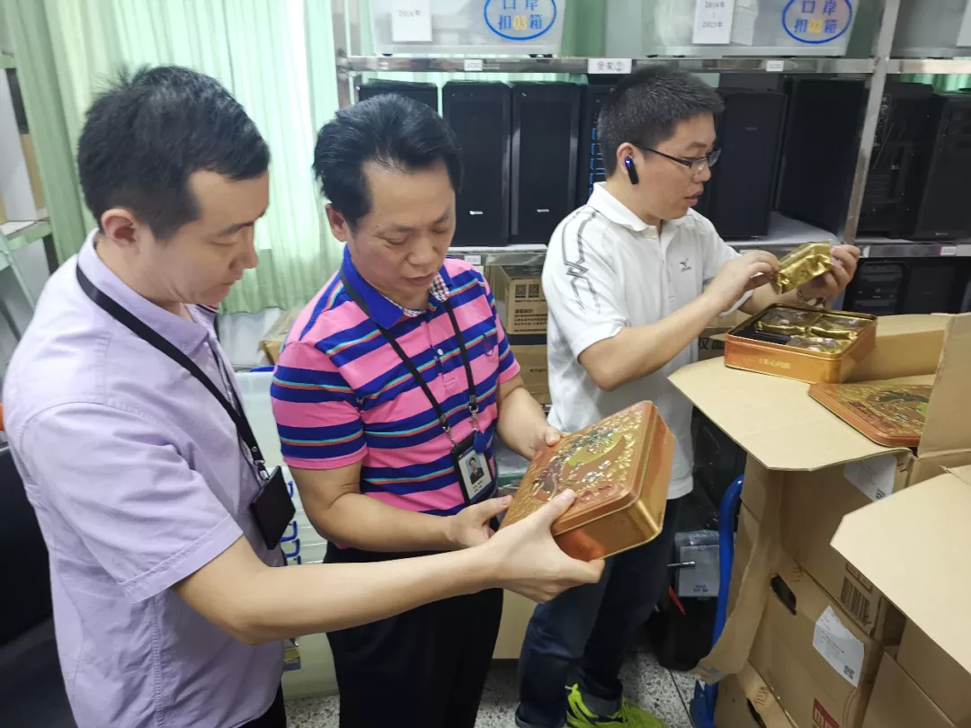 9月3日,深圳市市场监督管理局罗湖监管局接到线索:一消费者通过微信渠道购买一批香港知名品牌月饼,收货后怀疑为假冒商标食品并向口岸派出所报案。当天上午,罗湖监管局执法人员与罗湖公安分局口岸派出所民警迅速组成联合执法组展开行动,查获涉嫌假冒香港知名品牌的月饼300盒,经商标权利人现场鉴定,初步认定其中260盒为侵犯商标权食品,40盒为香港生产的无中文标签食品。
