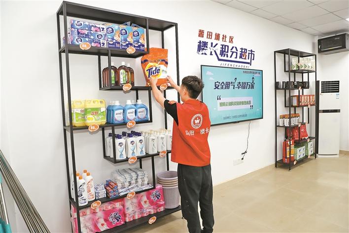 “楼长积分超市”由马田街道在光明区率先开设。社区网格管理站每月对楼长履职情况进行评分,评分项包括当月参与义警情况、平安员活动情况、人口申报情况、排查安全隐患情况、文明楼栋创建情况等23条内容。积分累计到一定分值,即可在“积分兑换日”到“楼长积分超市”兑换相应积分的实物奖品。