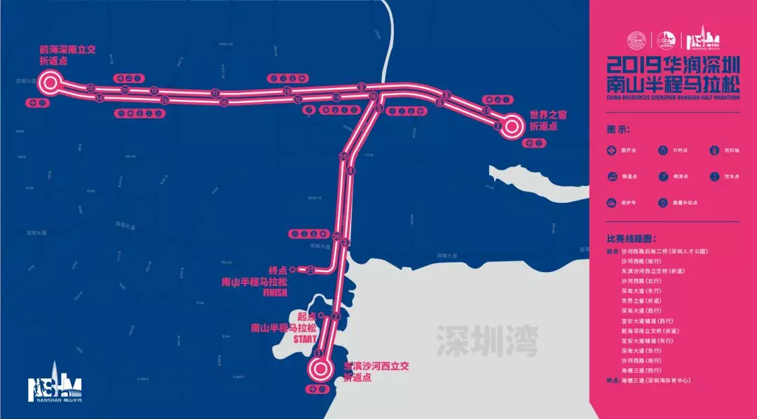 值得一提的是,今年南马的路线较去年略有调整,赛事线路整体呈T字形,赛道起点在沙河西路后海二桥(深圳人才公园东门),赛道终点在海德三道(深圳湾体育中心),赛道主体由沙河西路和深南大道组成一纵一横,途径深圳湾总部经济片区、高新技术园、大沙河生态长廊、世界之窗、南头古城等多个地标性建筑,不仅弥补了往年没有经过深圳湾海域的遗憾,让选手在赛跑之余一览湾区海景,更向选手与观众充分展示南山自然人文科技之美。