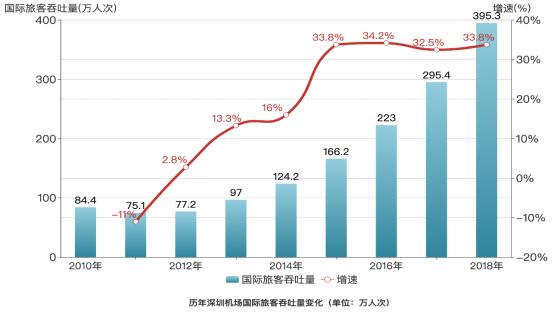 2018年,深圳机场围绕打造高水平对外开放门户枢纽的目标,持续完善国际航线网络布局,国际旅客吞吐量保持快速增长。全年深圳机场旅客吞吐量达到4,934.9万人次,同比增幅达到8.2%,增幅居内地前十大机场之首。2018年深圳机场新增15个国际客运通航城市,其中洲际客运通航城市9个,新开洲际航线数量为历年之最,也位列内地机场首位。机场国际旅客吞吐量进入快速增长期,近四年均保持着30%以上的增速发展。2018年深圳机场货邮吞吐量累计121.8万吨,同比增长5.1%。全年货邮吞吐量稳居国内第四,增速在全国主要机场中排名第三。