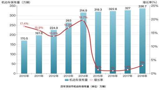 受新能源小汽车取消限购等因素影响,机动车保有量增速有所提升。2018年年底,深圳市机动车保有量约为336.7万辆,比上年增加9.7万辆,增幅为3.0%。自2014年实施小汽车限购以来,深圳市机动车保有量年增量首次达到近10万辆。就全市交通总体运行情况来看,因为下半年受开学季、中秋、国庆、“山竹”台风及持续降雨等多个特殊日的多重影响,整体上下半年交通运行差于上半年。