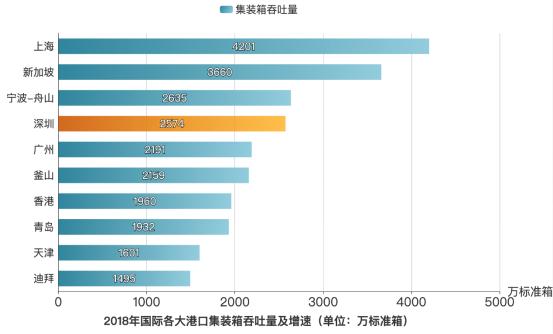 深圳市持续实施“深水战略”,港口万吨级泊位持续增加,港口集装箱吞吐量保持增长势头。截止2018年,深圳港共有万吨级以上泊位75个,同比增加1个。深圳港集装箱吞吐量达2,574万标准箱,同比增长2.1%,国内排名第3,国际排名第4。