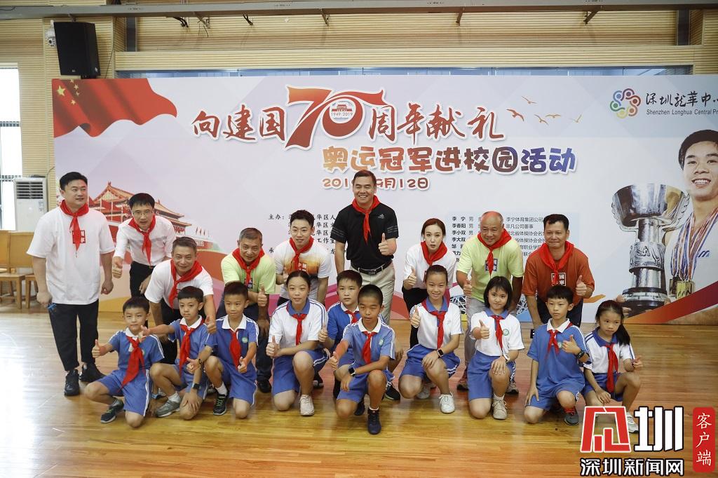 奥运冠军们和学生合影留念。
