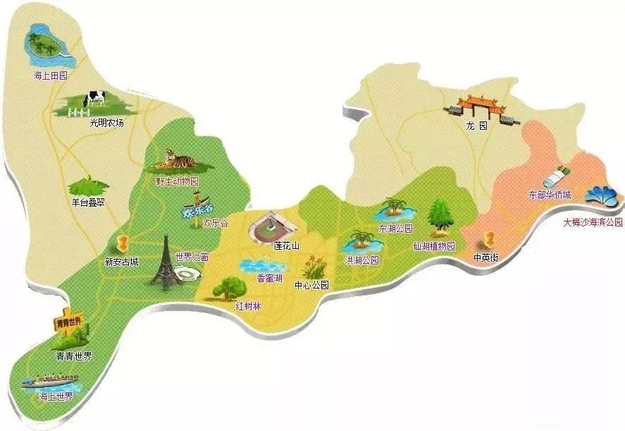 大小梅沙、大鹏片区、东部华侨城、宝安凤凰山、仙湖植物园、红树林、世界之窗、莲花山、东湖公园、福田农批市场