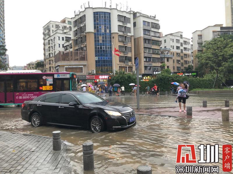 莲花路景新花园公交站附近,车辆和行人涉水。