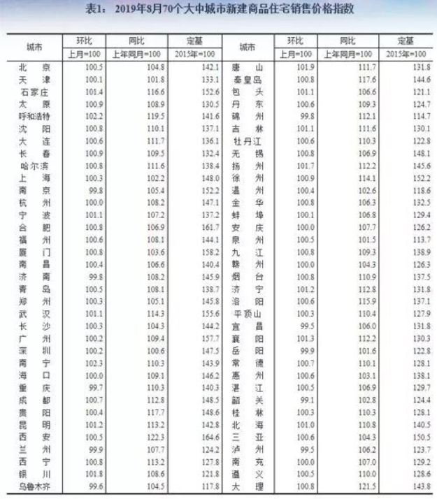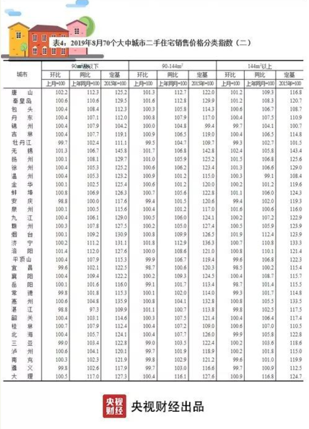 央视财经2019年9月18日讯 近日,国家统计局发布了8月份70个大中城市商品住宅销售价格变动情况:一二线城市新建商品住宅和二手住宅销售价格环比、同比涨幅均与上月相同或回落;三线城市新建商品住宅销售价格环比涨幅与上月相同,二手住宅涨幅微升。