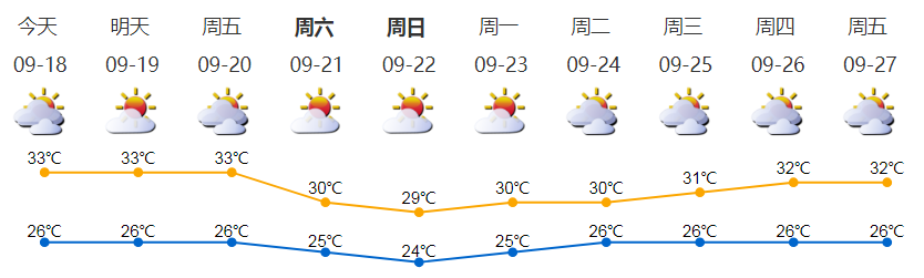 多云,有短时(雷)阵雨;气温26-33℃;东北风2-3级;相对湿度60%-95%