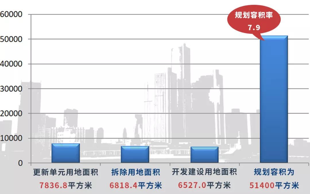 ▲更新单元用地面积7836.8平方米,拆除用地面积6818.4平方米,开发建设用地面积6527.0平方米,规划容积为51400平方米,规划容积率7.9。
