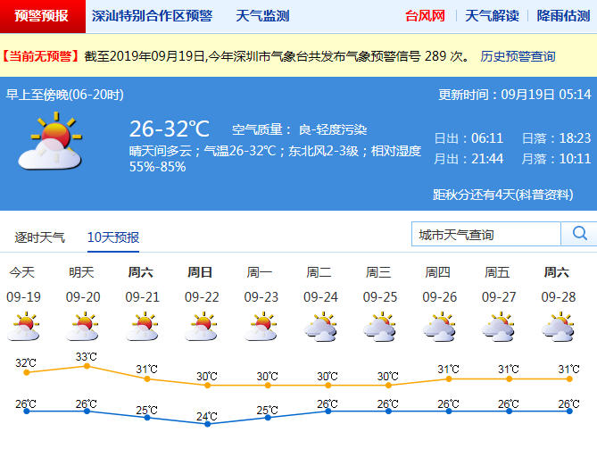 见圳客户端·深圳新闻网2019年9月19日讯 记者从深圳市气象局获悉19日晴天间多云,气温26-33℃;20-23日持续晴热干燥。其中菲律宾以东洋面的热带扰动云团正在发展,预计其总体趋势北上,对我市以及华南沿海无明显风雨影响,但20日前后将受其外围偏北下沉气流影响。