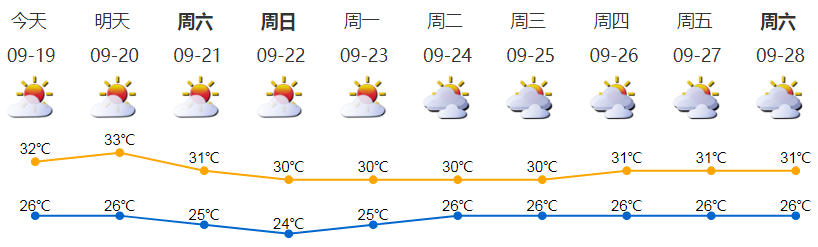 晴天间多云;气温26-32℃;东北风2-3级;相对湿度55%-85%。