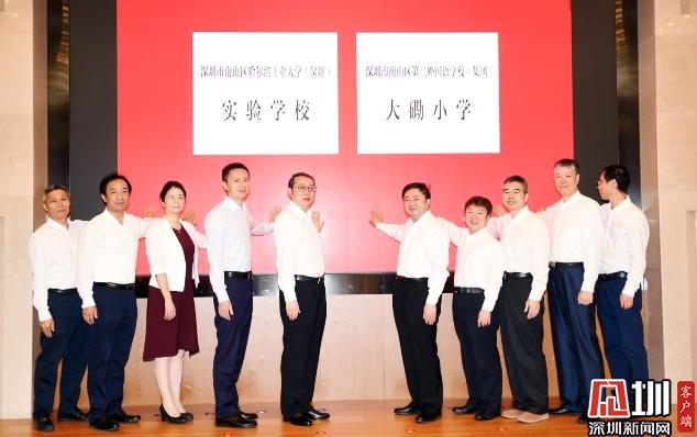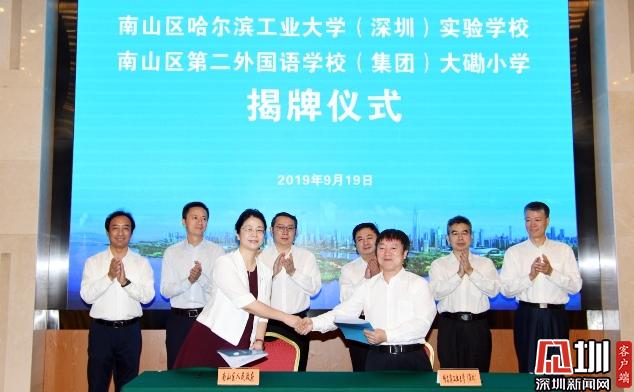 活动中,南山区哈尔滨工业大学(深圳)实验学校及南山区第二外国语学校(集团)大磡小学两所学校正式揭牌。南山区委书记王强,哈工大(深圳)党委书记吴德林,南山区委副书记、代区长黄湘岳,深圳大学城管理办公室副主任戴兴毅、哈工大(深圳)副校长姚英学、南山区副区长练聪、哈工大(深圳)工会负责人张敏等出席签约仪式,并为两所新校揭牌。南山区政协副主席、区教育局局长刘根平主持仪式。
