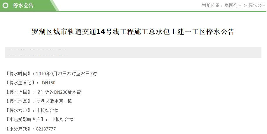 见圳客户端•深圳新闻网2019年9月22日讯 近日,深圳水务集团官网陆续发布停水公告。深圳新闻网记者了解到,9月23-24日,福田、南山、罗湖等区的多个小区和企业单位将受影响,请市民提前做好储水准备。