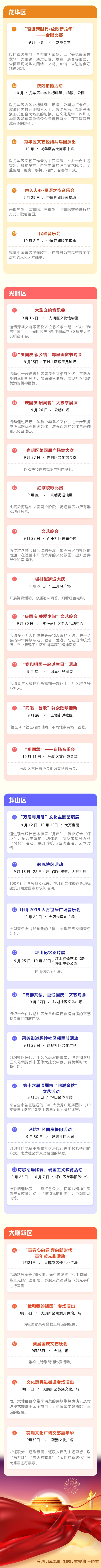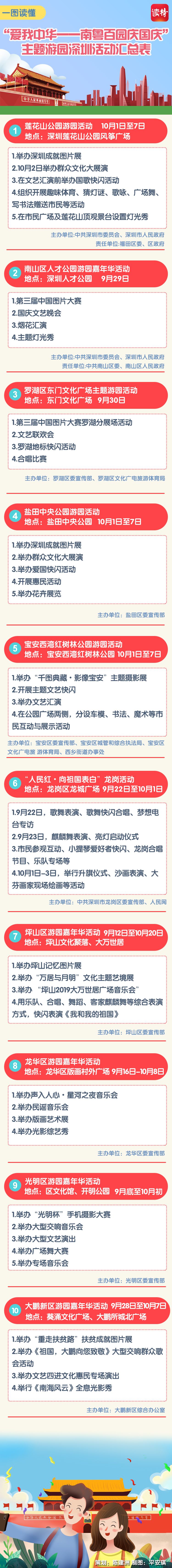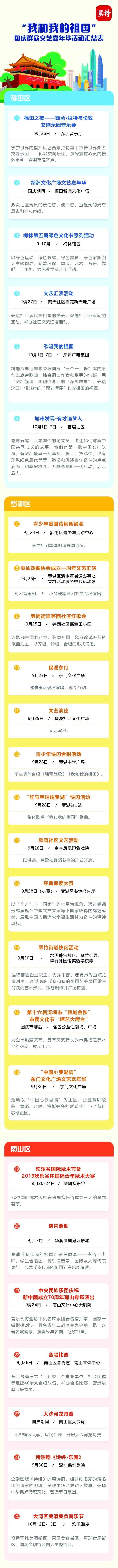 为庆祝中华人民共和国成立70周年,深圳市将举办专场音乐会、群众文艺晚会、焰火晚会等活动,同时将举行10场“爱我中华——南粤百园庆国庆”主题游园及80场“我和我的祖国”国庆群众文艺嘉年华活动。主题游园和文艺嘉年华活动安排如下: