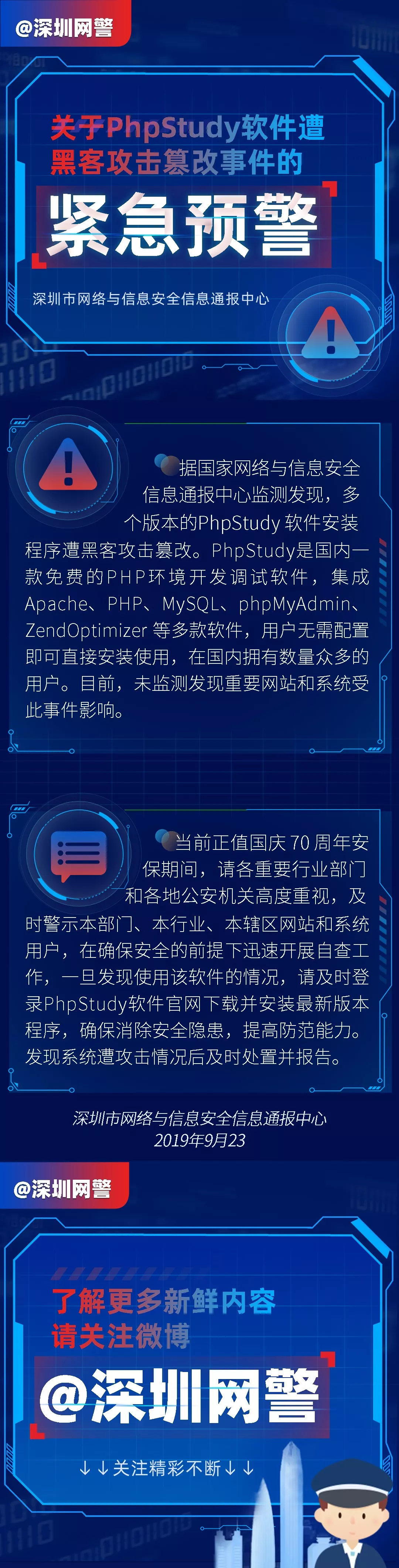见圳客户端·深圳新闻网2019年9月25日讯 据国家网络与信息安全信息通报中心监测发现,多个版本的PhpStudy软件安装程序遭黑客攻击篡改。目前,未监测发现重要网站和系统受此事件影响。