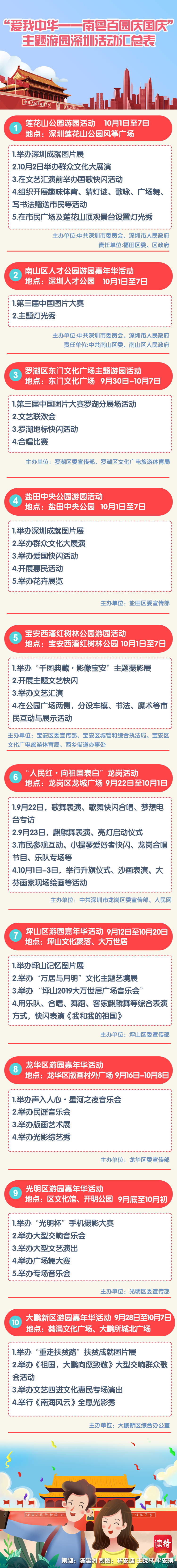 深圳特区报2019年9月26日讯 为热烈庆祝中华人民共和国成立70周年,深圳市将举办规模盛大的全市性专场音乐会、群众文艺晚会、焰火晚会等活动,同时将在各区举办80场“我和我的祖国”国庆群众文艺嘉年华活动,并在全市各区举行“爱我中华——南粤百园庆国庆”主题游园。各有关活动安排如下: