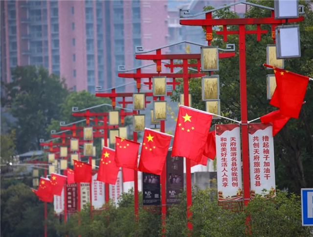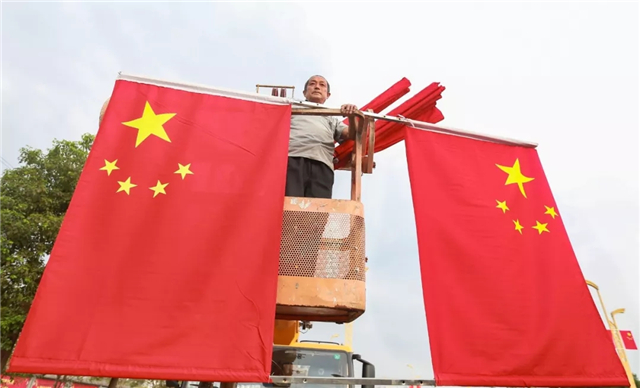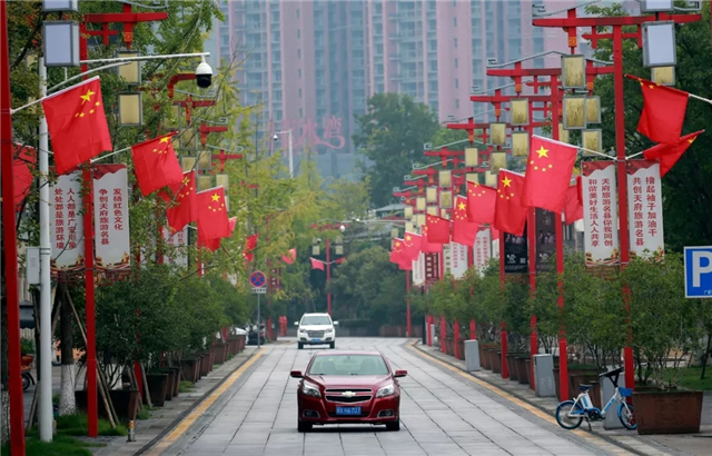 不止街道,全市党政机关、企事业单位、学校、大型购物中心、城乡社区、村庄等区域都升起五星红旗、悬挂标语,户外大屏、移动电视、公交车站等广告牌都张贴或滚动播出了庆祝新中国成立70周年的宣传标语。