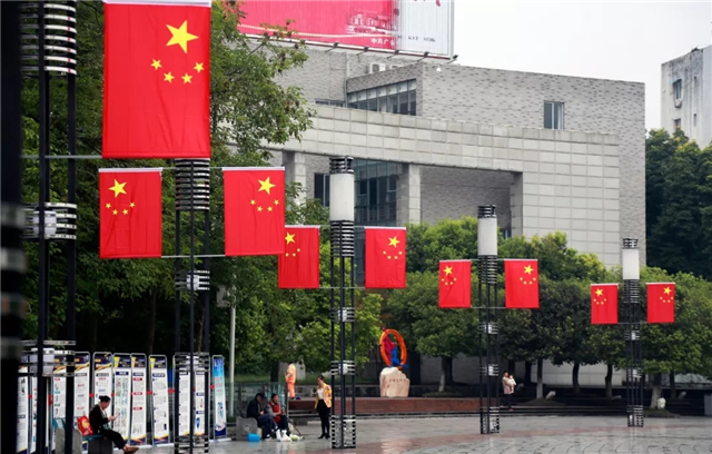 据悉,为庆祝新中国成立70周年,营造安定祥和的浓厚节日氛围,在市委宣传部的统一安排下,我市各相关部门以悬挂国旗、升国旗、唱国歌等形式营造节日氛围,爱党爱国爱社会主义的情愫在市民心中升腾。(广安日报全媒体记者刘婧/文刘秦君/图)