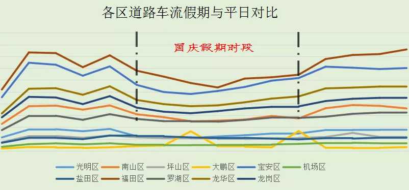 市内交通除大鹏和盐田区较平日有所上升外,其余各区均较平日车流减少30%左右。假日期间车流将集中在非上下班高峰的时间段。