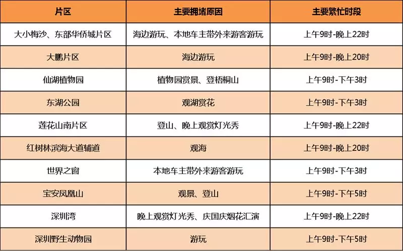 假日期间市内交通每个时间段相对均衡,不会出现工作日的早晚高峰,车辆主要集中在市内各景点和商圈周围,预计东部景区将会迎来巨大压力,尤其是大小梅沙、东部华侨城、盐坝高速葵涌出口。